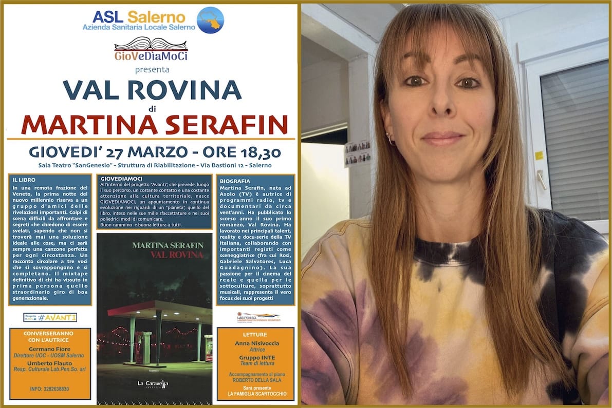 Il 27 Marzo alle 18,30 presso la Sala Teatro della Struttura di riabilitazione “I Giardini di Trotula” in Via Bastioni 12 a Salerno, all’interno della rassegna letteraria GIOVEDIAMOCI, sarร  presentato il libro “VAL ROVINA” di Martina Serafin, scrittrice e nota autrice veneta di programmi radio, tv e documentari nazionali da circa vent’anni. Lavora nei principali talent, reality show e docu-serie della TV e collabora con importanti registi come sceneggiatrice fra cui Gianfranco Rosi, Gabriele Salvatores, Luca Guadagnino. La sua passione per il cinema del reale e quella per le sottoculture, soprattutto musicali, rappresenta il vero focus dei suoi progetti