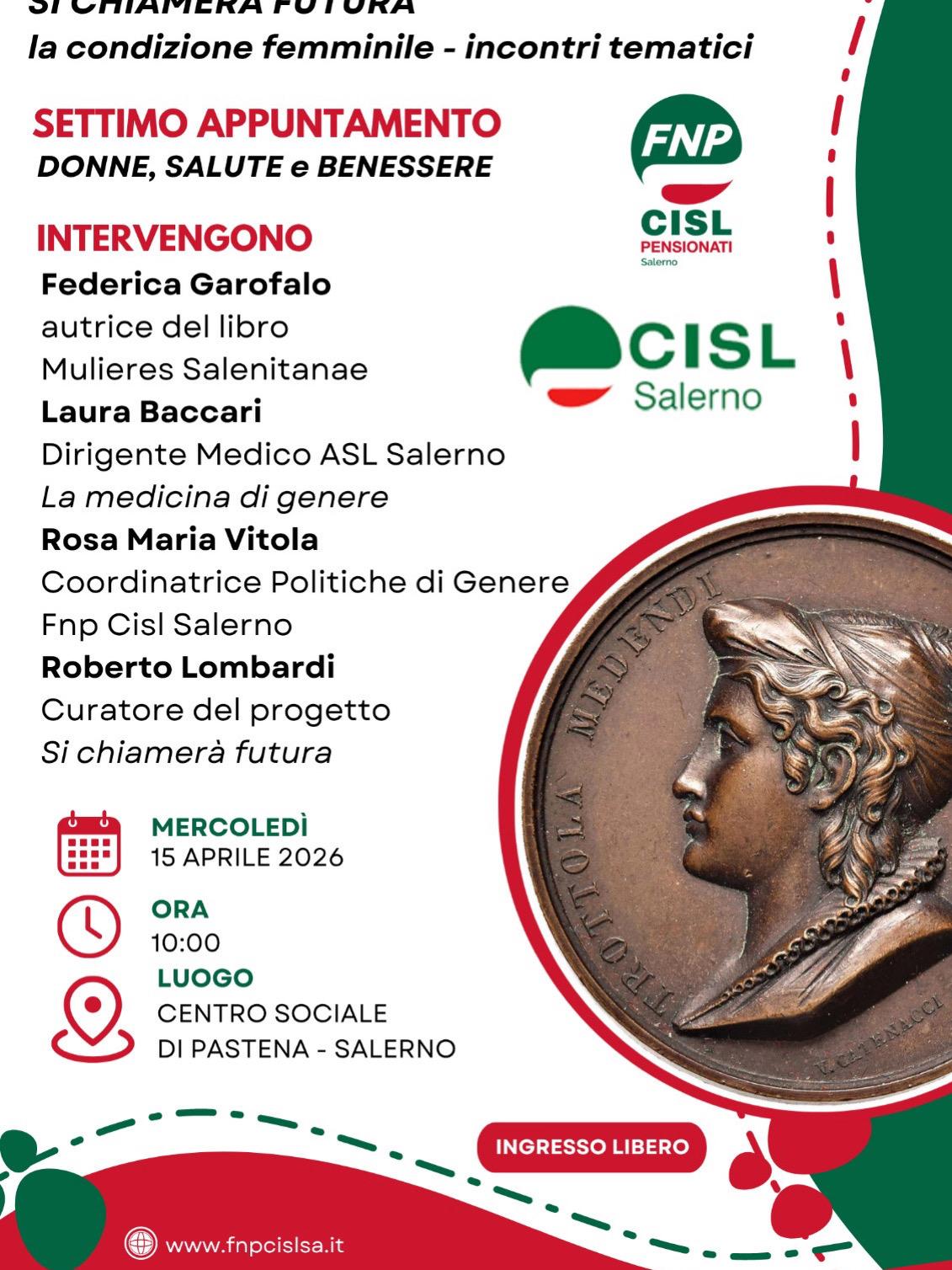 Il ciclo di incontri dal titolo “Si chiamerà Futura” è un progetto sul tema di genere sviluppato nell’ambito del programma di attività della Fnp Cisl Salerno, ideato dal Coordinamento Politiche di Genere, guidato da Rosa Maria Vitola, e curato da Roberto Lombardi.Il settimo incontro, previsto per mercoledì 15 aprile alle ore 10:00 presso il Centro Sociale di Pastena a Salerno, sarà dedicato al delicato tema della salute e del benessere femminile. Partecipano la professoressa Federica Garofalo, autrice del libro *MulieresSalernitanae*, e la dottoressa Laura Baccari, dirigente medico dell’ASL Salerno, che ha svolto recenti indagini sulla medicina di genere. La Salerno del Medioevo, città della medicina, nel libro MulieresSalernitanae, fa da sfondo a sei storie di donne che si snodano tra il 1084 e il 1422: sei storie di mediche, che, in qualità di donne votate alla medicina, vivono grandezze e drammi delle loro epoche da una generazione all’altra, e segnano con la loro presenza la parabola della Scuola Medica Salernitana, dagli splendori dell’anno Mille alla decadenza del Quattrocento. Dai principi tramandati dalla Scuola Medica Salernitana alla medicina contemporanea, la dottoressa Laura Baccari affronterà un tema di granderilevanza: la medicina di genere. Questa disciplina si prefigge lo scopo di studiare l’influenza delle differenze biologiche e socio-economiche e culturali sullo stato di salute e di malattia di ogni persona. La ricerca e la pratica medica dovrebbero tener conto delle differenze biologiche tra i due sessi, garantendo un trattamento personalizzato e sensibile alle necessità di ciascuno. Educare i medici alla medicina di genere dovrebbe essere essenziale. Oggi permane l’assenza di un corretto e bilanciato arruolamento di donne, uomini e/o transgender negli studi clinici sperimentali sui farmaci perché ciò rende questi studi molto più complessi e costosi.  Tutto ciò porta ad una mancanza nell’equità di cura.